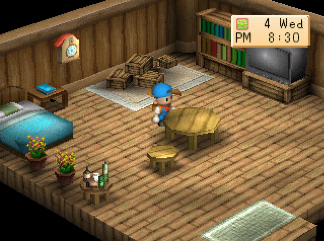 Like many Harvest Moon games, the house in Back To Nature is important as it is the only place where you can save your progress; i.e. the journal by the bed. Many Harvest Moon games treat getting new furnishings as a simple extension of remodeling or “upgrading” as they often call it in game. Now some Harvest Moon games make house upgrading a means of showing how well off you are at playing farmer. By the time you can afford the biggest house upgrade, odds are you have a few years under your belt. Heck, A Wonderful Life takes this further and simply nets you a house upgrade every few years for big family situations like when you first get married or have child who has aged past babydom. Back To Nature, on the other hand, makes house upgrading a key component to getting married.