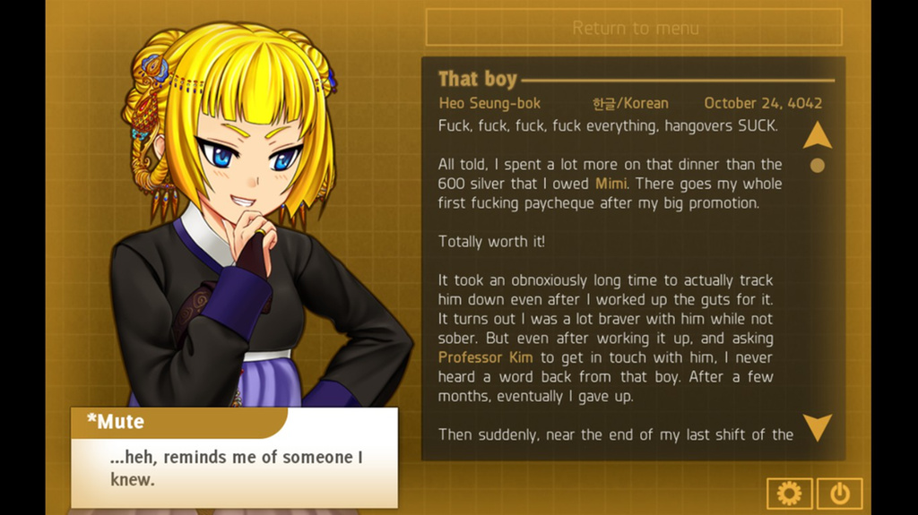 The player’s goal is to connect to the ship’s computer and salvage various text logs from the ship in order to uncover the truth behind the ship’s downfall. In order to aid the player, two AI’s can be reactivated from the ship’s computer: *Hyun-ae, a polite yet forward-thinking AI who has mysterious ties to one of the former families aboard the Mugunghwa and *Mute, the brash but traditional AI who served as the Mugunghwa’s security system.