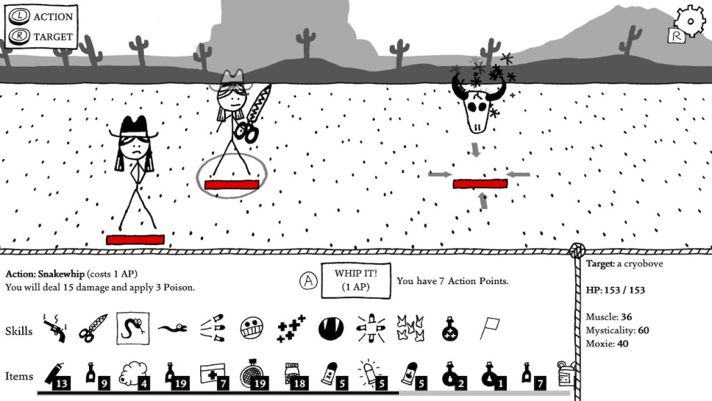 Combat in West of Loathing is simplistic and turn-based. The player gets skills tied to their specific job class, and can learn additional skills from books. Other skills not tied to the player’s job class can be earned from obtaining necromancy (or ‘Nex-Mex’) tomes or…playing a tabletop RPG campaign with a bunch of nerds. Stats and damage are calculated based on efficiency and resistance to melee, magic, ranged damage, status effects, and specific damage types. Pardners have a smaller skill pool but can offer unique support to the player, such as healing or providing defensive cover. The player gains EXP from successful victories, and can disperse EXP to their stats or level up skills.
