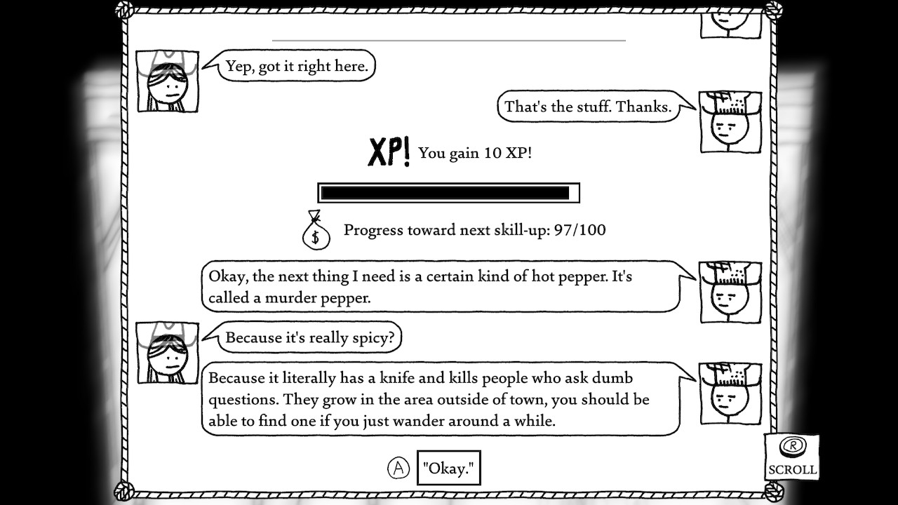Combat in West of Loathing is simplistic and turn-based. The player gets skills tied to their specific job class, and can learn additional skills from books. Other skills not tied to the player’s job class can be earned from obtaining necromancy (or ‘Nex-Mex’) tomes or…playing a tabletop RPG campaign with a bunch of nerds. Stats and damage are calculated based on efficiency and resistance to melee, magic, ranged damage, status effects, and specific damage types. Pardners have a smaller skill pool but can offer unique support to the player, such as healing or providing defensive cover. The player gains EXP from successful victories, and can disperse EXP to their stats or level up skills.