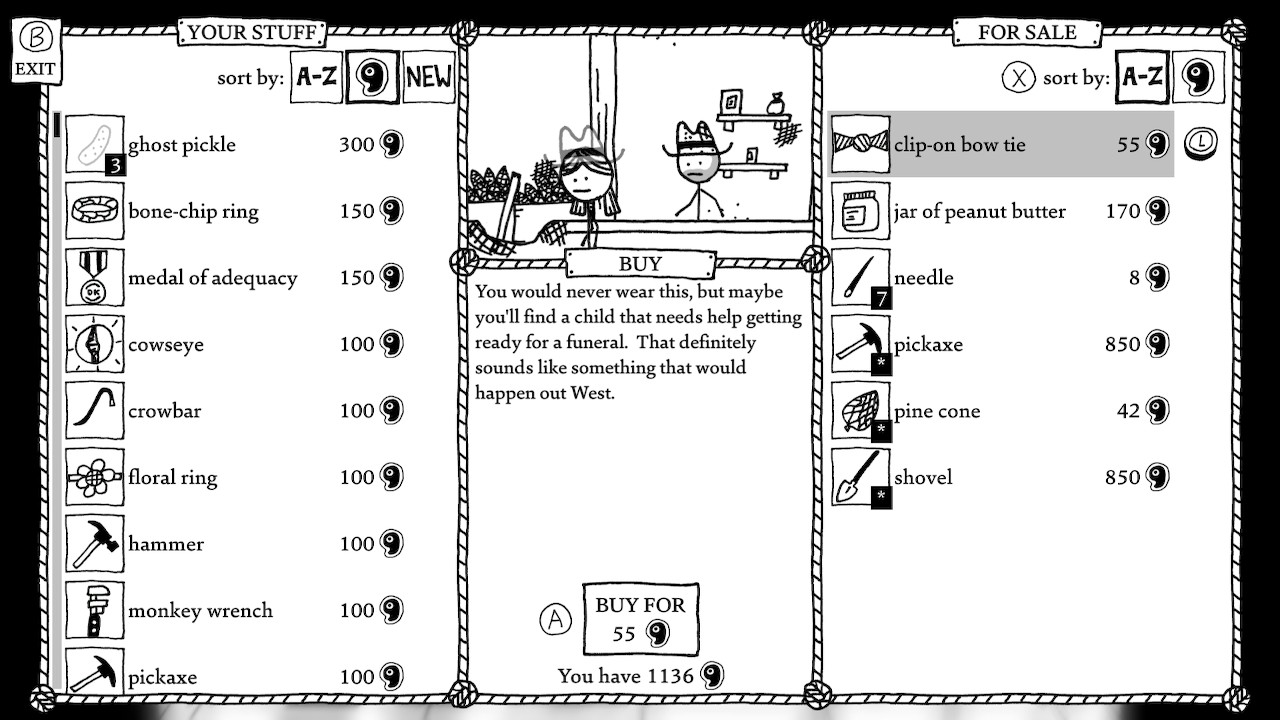 West of Loathing does have some issues, but thankfully none that are especially glaring. On the more nitpicky side, I wish the game used a tab system instead of a scrolling list to organize the inventory. I also wish the game had a better means of tracking side quests, because it’s very easy to get distracted and forget that you need to get x item for y NPC in z location because you found a random ranch and needed to shoot some Hellcows. On the more serious end of issues, the game autosaves by default, and you cannot manually save. This was likely done to prevent save scumming and encourage multiple playthroughs, but it can be pretty frustrating if you mess up a sidequest (like the quest to get the secret third party member) and get locked out for the rest of the game. Lastly, there’s some occasional obtuseness with some of the game’s puzzles. There’s an infamous puzzle involving having to guess the name of a favorite granddaughter for a ghost in one of the graveyards, and the correct answer is randomized per playthrough. Thankfully, the game has a very extensive Wiki, so help isn’t too far away.