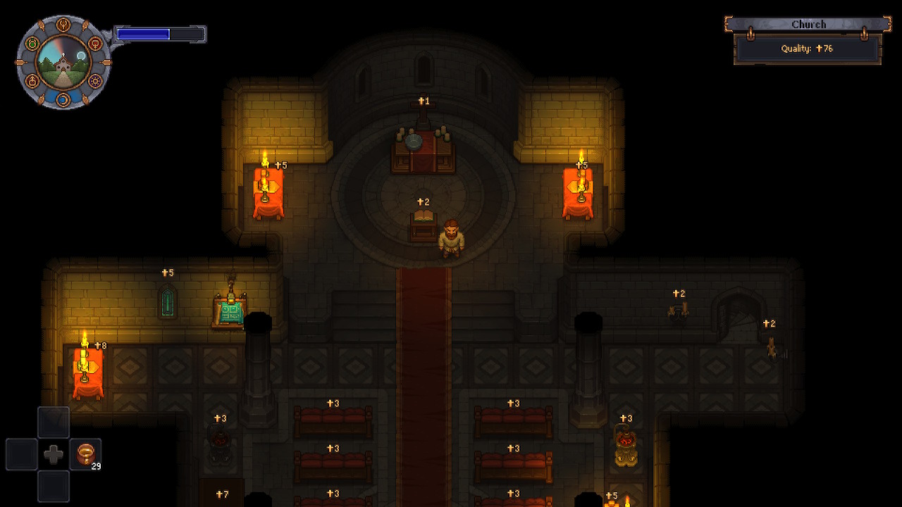 Graveyard Keeper is poison. Tasty, tasty poison drinkable for hours. Building river-crossing bridges and clearing dark dungeon tunnels are the big early tasks for this game’s time traveled protagonist, and for a lot longer than most games, Graveyard Keeper is all about this life. The exploration part of the brain starts flaring when it comes to bridges and tunnels. Farm sim worlds are often small, so investigating each corner via horse riding back and forth, up and down, left and right, is its own limited joy. Oh neat, because of my effort, I now have a secret tunnel to the village center. Good job me, I found the mines where marble is located. So that’s how embalming works? Graveyard Keeper gives the impression of productivity, like when fifty glass bottles are set to be crafted in the kiln and my character wakes up to dozens of them crowding the ground. Any game about making esoteric items will soon turn into a game about giving away esoteric items, an act of mentally juggling unpleasant people’s scheduling for delivering their every want and need. This is unfortunately the only way to advance Graveyard Keeper’s thin premise of trying to return to your future girlfriend. By the end, I was rewarded with a brief cutscene and a slap on the ass.