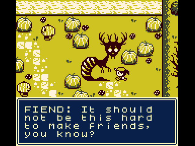 Rather than the more stereotypical jump-scares-and-gore horror affairs, Deadeus works within the constraints of the GB hardware and focuses more on an unsettling atmosphere in contrast to the cutesy sprites. -IZMA- does a lot of really cool horror-themed artwork, and it really shines throughout, particularly in the boy’s nightmare sequences, as well as the scenes depicting Deadeus himself. Stoo Busby’s chiptune compositions for the game, especially with the overworld music changing between days, adds to the game’s environment. What I appreciated most about Deadeus was the tone of most of the endings; without major spoilers, I’ll say most of the endings maintain a somber and bittersweet tone overall. Deadeus has an overall strong execution that works well with the GB Studio limitations.