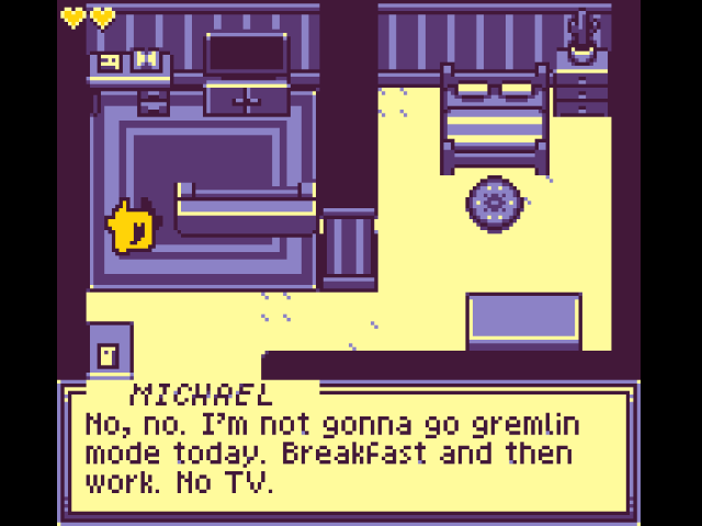 Michael the Ant Thumper is a genuinely hilarious little game. It has little cutscene interstitials thanks to a custom tool the developer created, usually whenever Michael answers his phone. Most of the game’s great humor is a mix of the cutscenes, dialogue, and the environmental objects you can examine, like Lewis putting an empty pizza box back in his fridge, or the silly office workers’ notes. The actual action parts of the game are pretty barebones, but the game is so short it doesn’t really matter, though I appreciate it as something new from the usual GB Studio adventure game fair. The game does have multiple endings but thankfully they’re all easy to get in a short time. Michael the Ant Thumper, in general, is really fun and quirky.