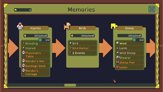 Even on the easier difficulties, DotAGE can be stressful. As an experiment for the second playthrough, the easiest difficulty was used to test if DotAGE was worth playing for someone who was more interested in the lizard-brained task of upgrading buildings and unlocking memories. Memories are the game’s progress system, where the elder recalls aspects of life, from mundane things like the existence of pigs to complex ideas like the concept of grief. It’s akin to the dork in a sports manga that knows all the terms and plays who manages the protagonist, who is naturally talented at pitching even though they’ve never thrown a ball. Leisure can happen in the easiest difficulty, which is why it was so easy to lose hours at a time to j pecking away at forests and building niche amenities (one is a Japanese restaurant which requires a designated sushi chef Pip). A balancing problem with the memory system is that certain live resources would not spawn, even when given access to them. For instance, fish huts could have been built in the first playthrough, but fish themselves were not present. The end game big event, which will not be spoiled here, even in the easiest mode, still requires a grasp of the different systems a fifty plus member village requires to function. The game is intended to be played over and over, with the motivation for further stories involving new elders to use and different cultural settlements to build.