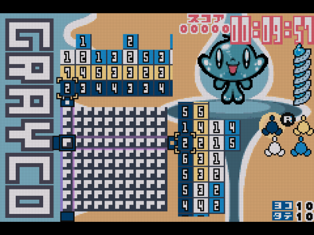 Hatena Satena follows similar structures to nonograms, but uses color swatches instead of numbers. The horizontal and vertical axes indicate how many blocks of color need to be filled in each row and column. The gameplay is comparable to the Voltorb Flip minigame from the Pokemon HeartGold and SoulSilver releases from certain territories, intended to replace the in-game slot machines. Both Voltorb Flip and Hatena Satena involve pattern logic work to mark the correct tiles. Stages are timed and the player is given a certain amount of errors they can make per puzzle. Successfully filling in consecutive tiles of the same color will result in a fun animation of your little alien buddy and the game will autofill multiple tiles. I am interested in the game’s story, especially since there are side-modes that involve hanging out with specific characters, so hopefully someone will make a fan translation in the future.