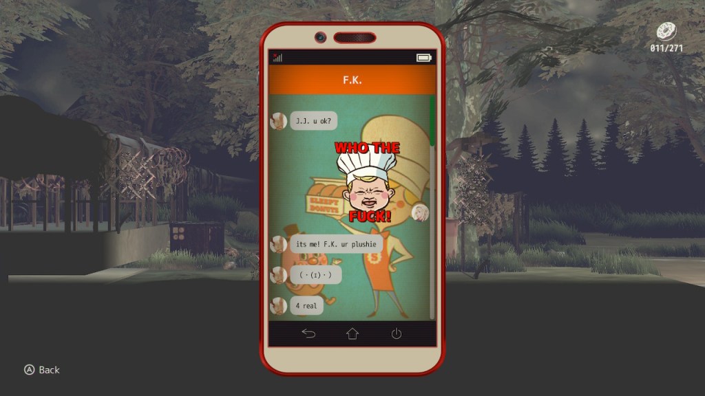 Phone messaging can also be used for storytelling. The Missing: J.J. Macfield and the Island of Memories is a surreal body-horror-flavored puzzle platformer by Swery65, of Deadly Premonition fame (infamy?). The Missing focuses on the titular J.J., who is searching for her missing friend Emily, while self harming and literally tearing her body apart to navigate various areas in the environment. The underlying story and character conflicts are gradually revealed through the game’s messaging system, wherein J.J. converses with several unseen NPC’s up to and including her destroyed chimera plushie, F.K. The game uses a messaging system similar to LINE, a popular instant messaging service that allows users to use virtual stickers from a variety of IP. In The Missing, the equivalent stickers tend to be of expletives, which J.J. liberally uses whenever F.K. attempts to contact her. While not a central gameplay mechanic, The Missing is a strong example of using phone messaging for narrative purposes.