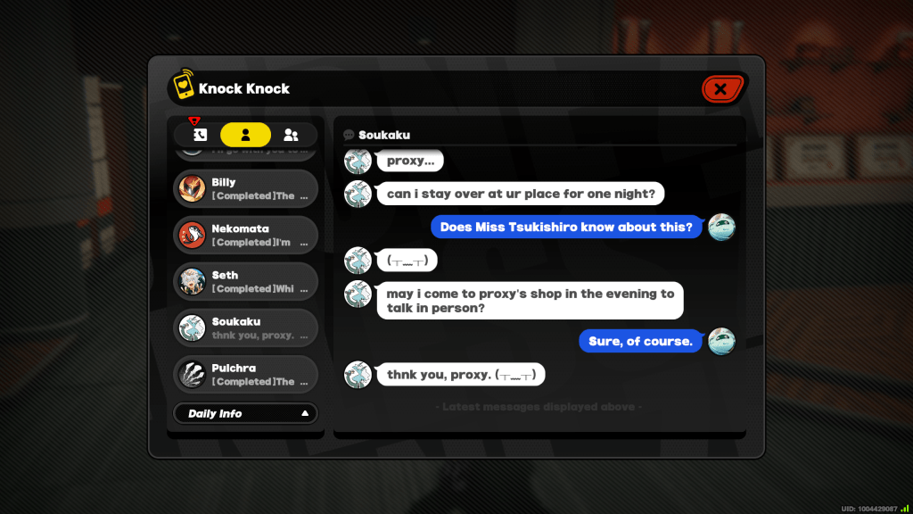 Within the retrofuturism setting of Zenless Zone Zero is the ability to…hang out with obtained playable characters for added backstory lore and obtaining pull currency and battle perks. Usually this is accomplished by simply messaging the character in question and inviting them out for a hangout date at the game’s various locales. ZZZ‘s writing and absurd attention to detail is reflected in its messaging system, which often gives characters unique quirks in their replies to the protagonist. For example, trucker Piper, who acts like an old woman despite looking quite young, peppers her messages with trailing ellipses. Meanwhile childlike oni girl Soukaku’s all-lowercase texts are full of haphazard spelling errors and emojis. In a game that loves to be liberal with character model and animation details, the extra touch with characters’ texts is a fun addition.